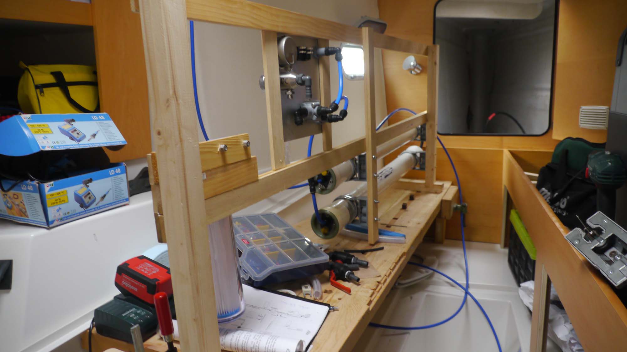 Übrigens auf dem Bild ist nicht nur der Rahmen mit einem Teil vom Wassermacher, wenn Du Allure kennst, siehst Du auch, dass die Steuerbordkabine vorne ganz umgebaut wurde. Links steht der Rahmen vom Wassermacher auf meinem alten Werkbank, der schon in Veltheim gute Dienste geleistet hat. Er dürfte jetzt einiges über 30 Jahre alt sein. Rechts siehst Du das Notbett, darunter der Gefriehrschrank, platz für den Drucker und anderen Plunder.