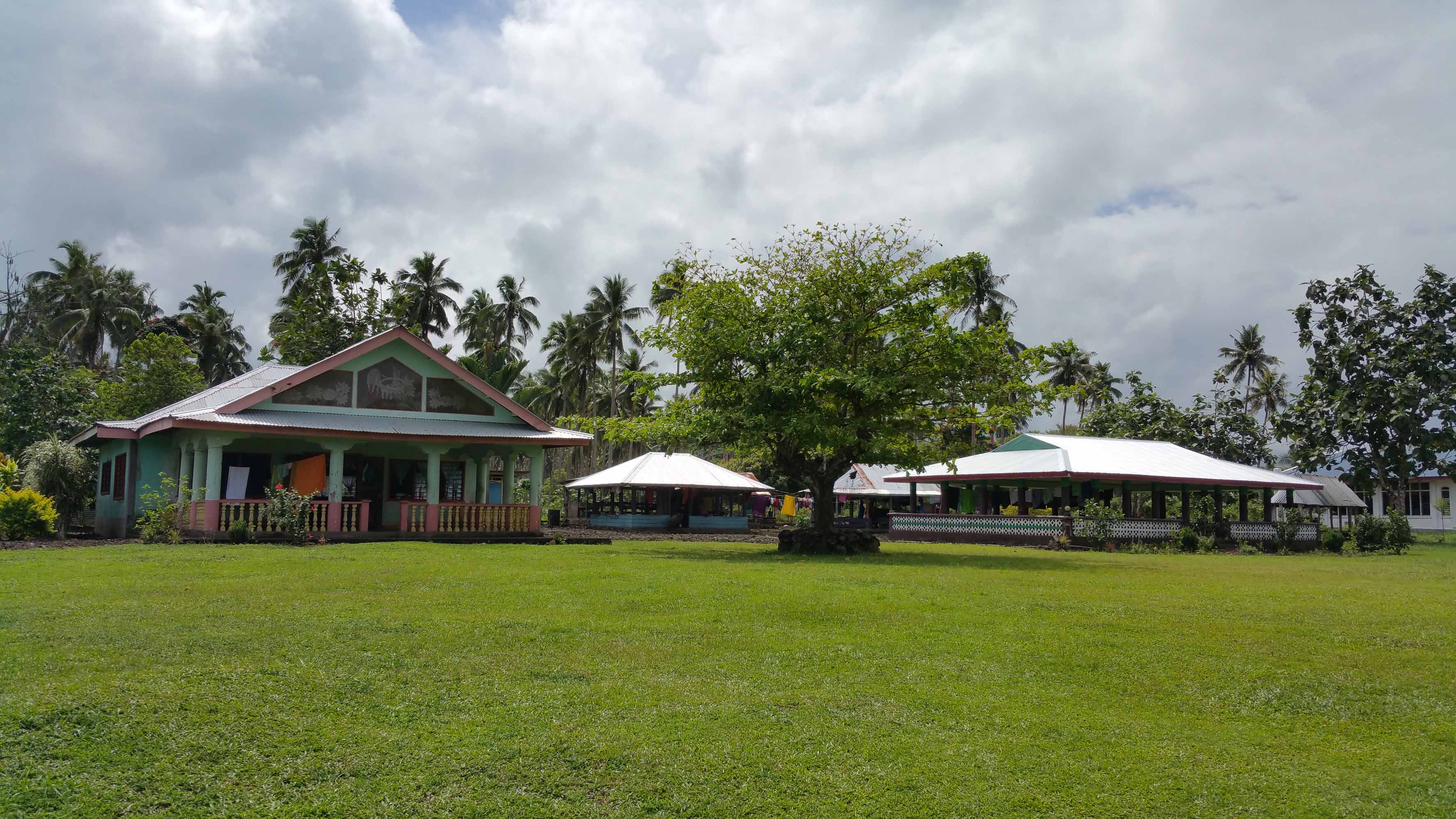Hier eine typische Wohnsiedlung. Links das offene Haus – nennt sich Fale. Besteht aus Boden, Säulen und Dach. Auch heute noch wird darin gewohnt. Geschlossene Räume gibt es nicht. Manche Fale sind mit Stoffen unterteilt, manche auch einfach offen. Dann im Hintergrund rechts ein «normales» Haus. Und im Vordergrund das Familiengrab. Jawohl, fast alle Grundstücke beherbergen auch ein Grab mit ein bis mehreren Toten. Es gibt