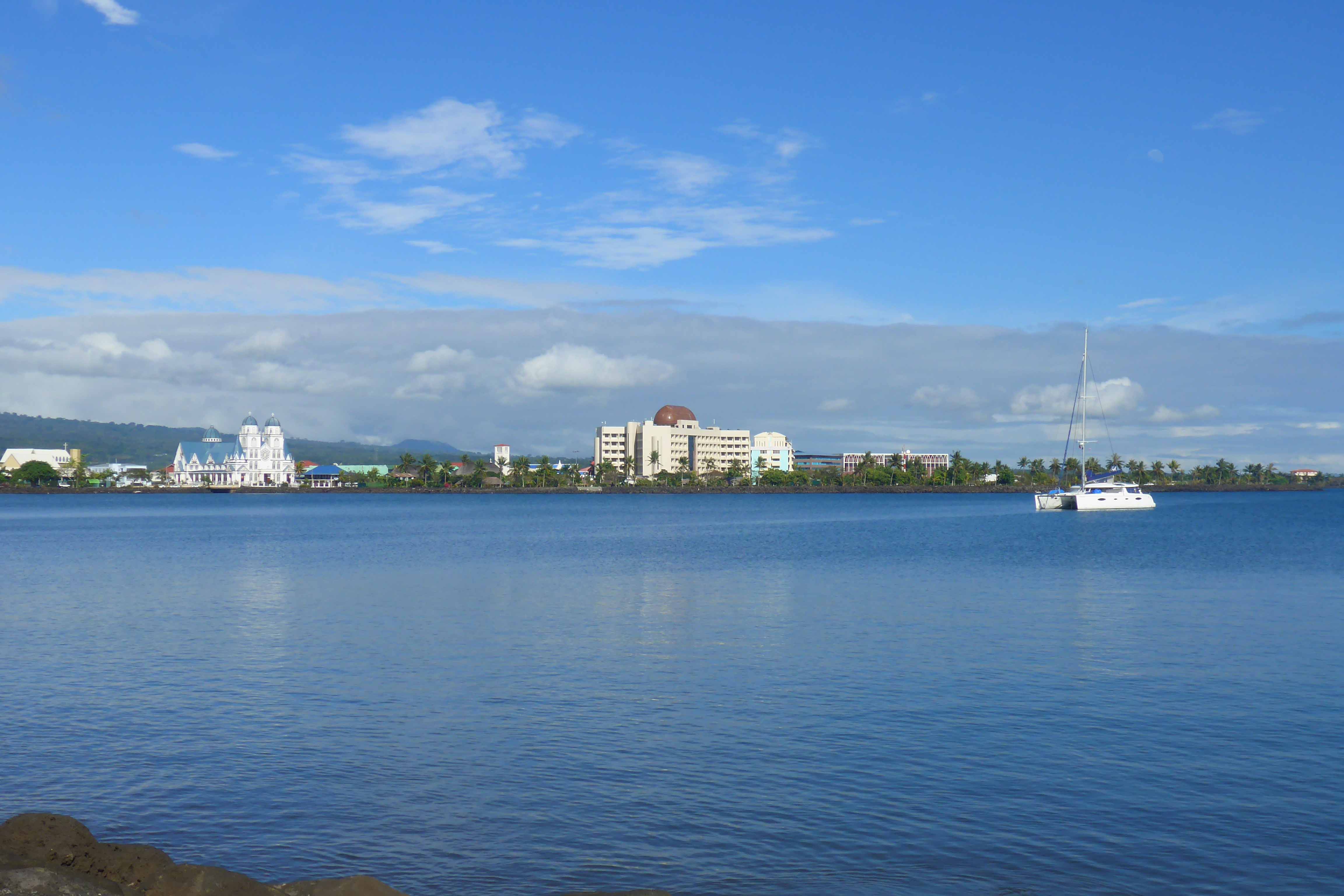 Das grosse Haus im HIntergrund ist das Regierungsgebäude. Die Kuppel ist ein nachgebautes Fale. Und wie überall in Polynesien, Kirchen. Wir sahen auch hier in Apia eine Kirche nach der anderen. Ansonsten ist es eine recht moderne Stadt.