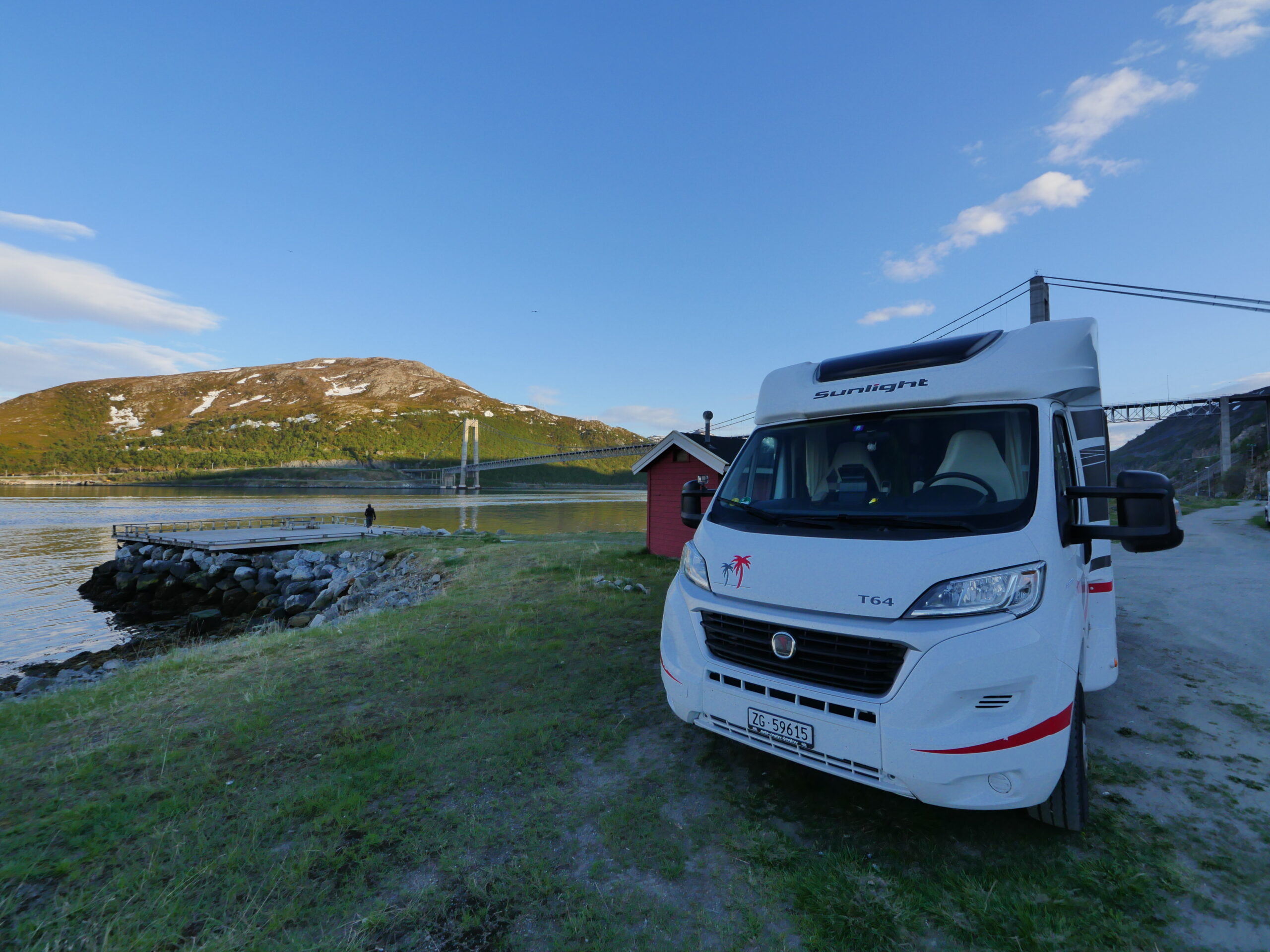 Wir nehmen die schon gefahrene Route wieder unter die Räder und fahren 40km zurück zur E6. Die nimmt uns ohne murren auf und bringt uns bis fast nach Hammerfest. Wir übernachten wieder einmal an einem fantastischen Plätzchen bei der Kvalsundbrua. Das ist die längste Hängebrücke von Europa.