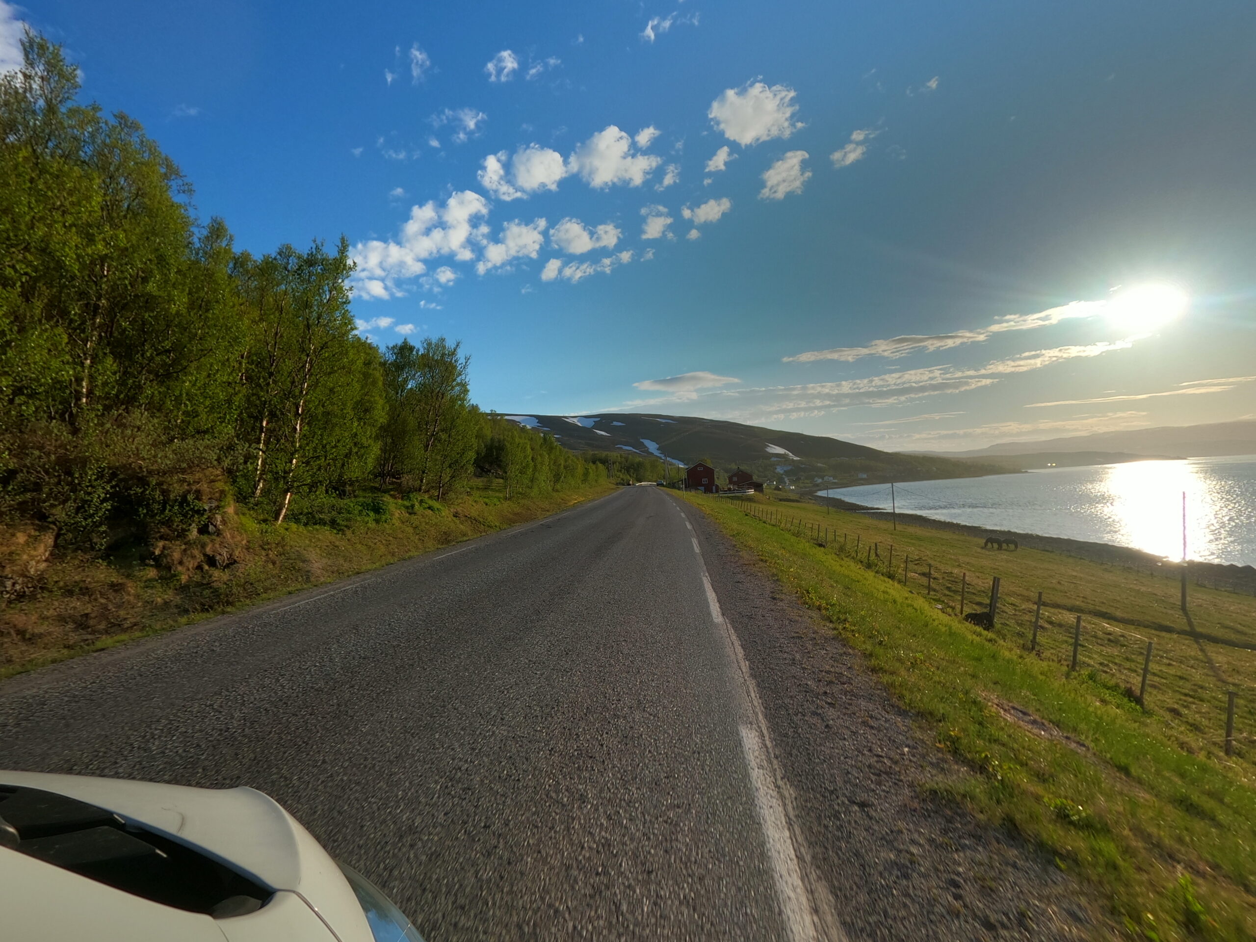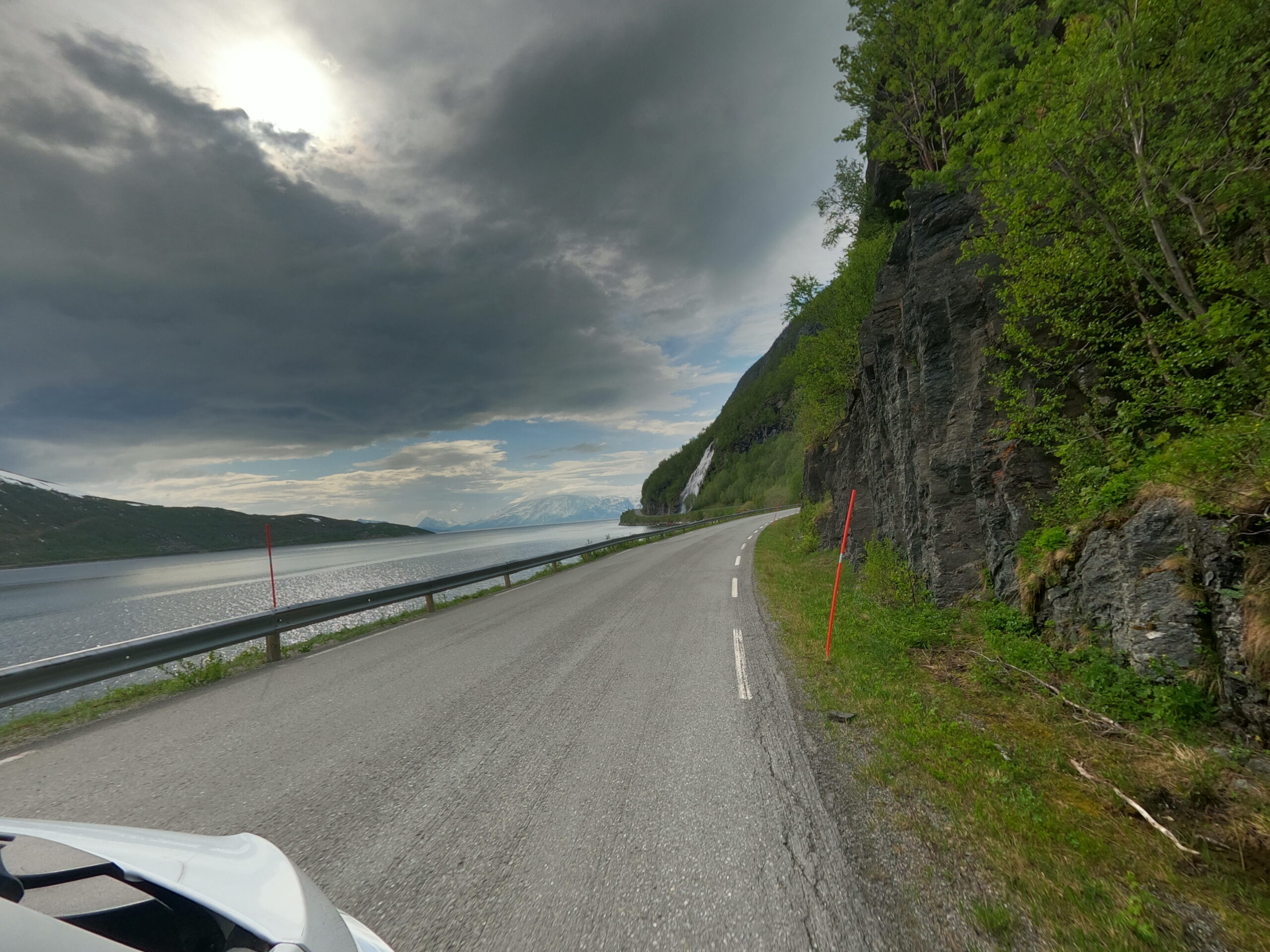 Ablegen in Alta. Dann ein Stück der E6 entlang. Und dann beim Leirbotnvannet links weg auf die 883. Die 883 führt der Küste entlang und verspricht besonderes. Schon bald zeigt das Garmin einen komischen Kurs. Also Smartphone Navigator konsultieren. Alles gut. Weiter. Nach einem Weilchen zeigt auch der Navigator einen komischen Kurs. In der Zwischenzeit bewundern wir die Natur neben der engen und gewundenen Strasse. Das Navi sagt umkehren. Schlumpf wird nervös, da stimmt doch etwas nicht. Auch meine Karte zeigt einen Unterbruch in der Route.