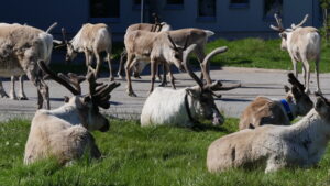 Zurück auf unserer Farm werden wir von Anna-Mari ins Rentierleben eingeführt. Sie erzählt wie das so läuft mit all den Tieren. Ein Farmer hat so um die 500 Tiere. Jedes Jahr gibt es Junge. Die einen werden als Fleisch aussortiert, die andern dürfen weiter leben. Alle Tiere sind im Sommer irgend wo wild draussen. Einige mit GPS, so werden alle auf den Herbst zusammengetrieben, verteilt auf die Besitzer bis in den Frühling. Dann fängt der Kreis neu an. Alle Besitzer helfen mit. Man erkennt den Besitzer am Kennzeichen am Rentierohr. Dieses Zeichen ist in Familienbesitz.